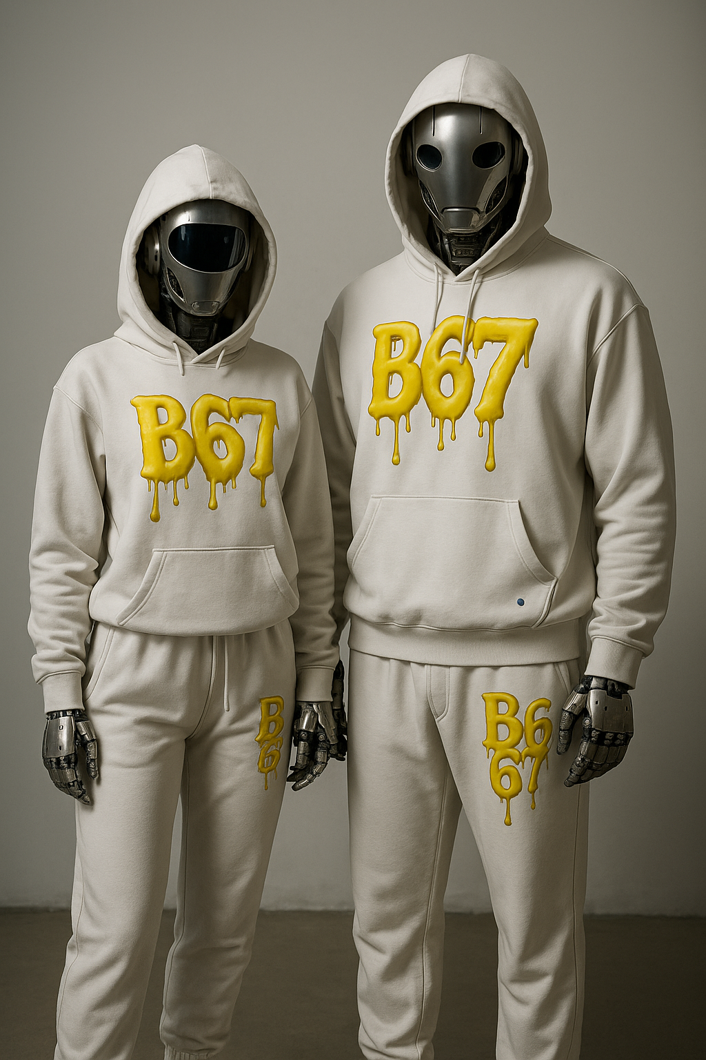 These white joggers bring a bright, fresh look with the bold yellow B67 drip logo on the leg. The color hits hard, giving the pants a standout energy while keeping the overall style clean and modern. The fit is soft, comfortable, and easy to wear, whether you’re out for the day or chilling at home. A sharp, eye-catching piece that brings the full B67 attitude to your everyday look.